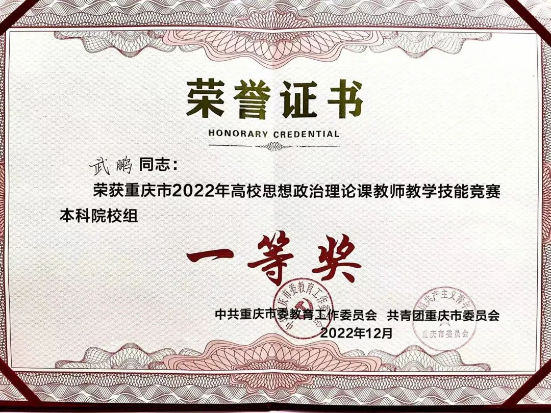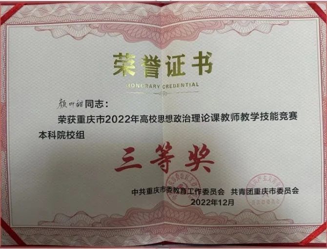 近日由重庆市委教育工作委员会、共青团重庆市委员会主办,重庆工程职业技术学院承办的重庆市2022年高校思政课教师教学技能竞赛落下帷幕。学院教师武鹏、颜叶甜分别获得本科院校组一等奖和三等奖。