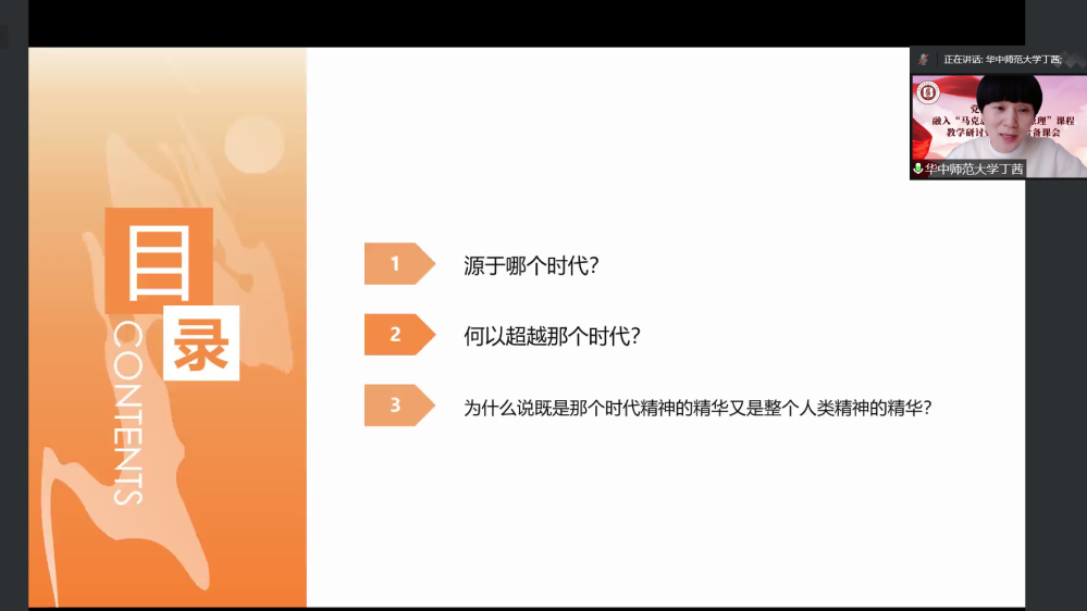 示范教学环节由教育部“全国高校思想政治理论课教学标兵”、华中师范大学必赢3003no1线路检测中心丁茜副教授展示。她以“走进马克思主义”为论题,从马克思主义源于哪个时代、它何以超越那个时代、为什么说马克思主义既是那个时代精神的精华又是整个人类精神的精华三个层面逐层分析,阐述了马克思主义的创立、发展和价值。