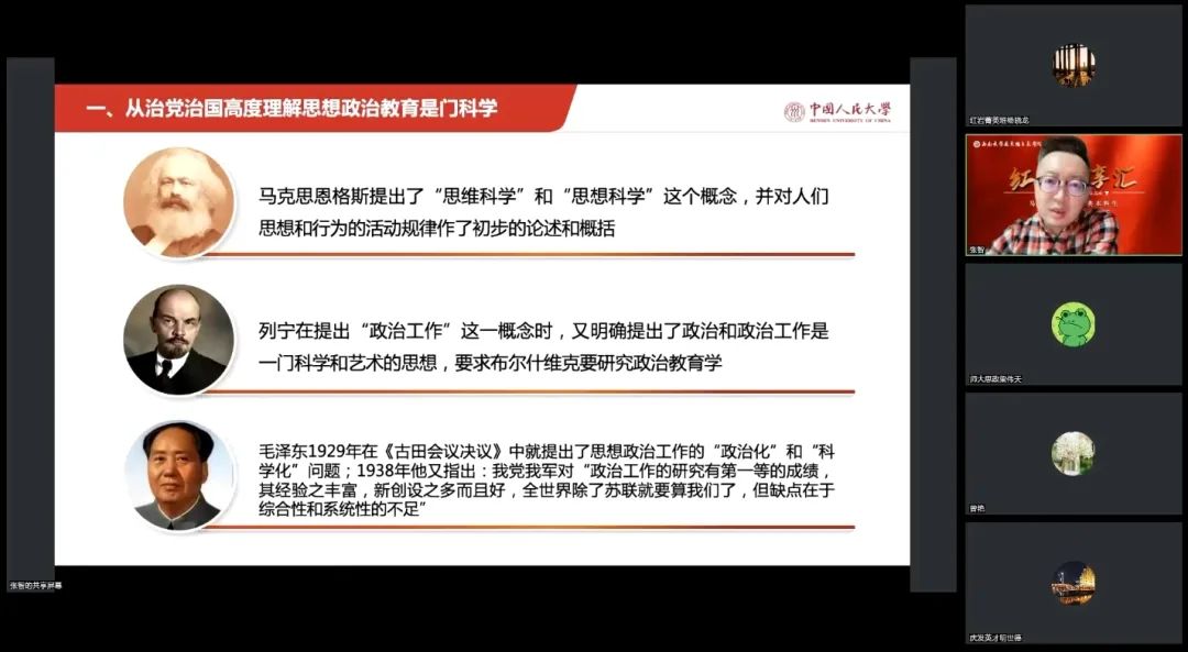 此次学术论坛线上参会人员近百人。会后,同学们收获颇丰、感触颇多。红岩菁英班学员周庆庆表示,张教授的讲座不仅是对主题本身的系统阐述,同时也在如何从政治文件、多维角度中寻找和解构学术命题等具体科研方法上带给她以极大启发。