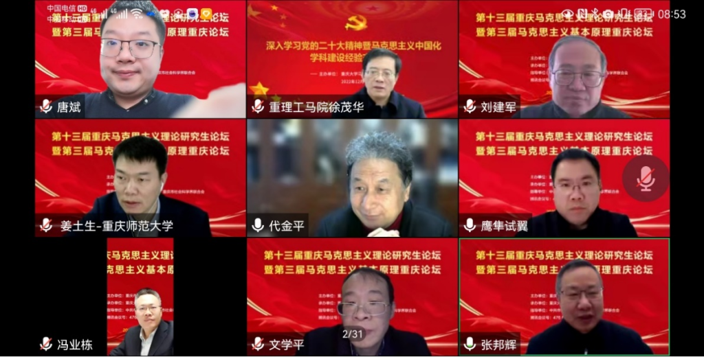 2022年12月17日,为深入学习贯彻党的二十大精神、深化习近平新时代中国特色社会主义思想的科学研究和教学融合,由中共重庆市委宣传部、重庆市社会科学界联合会指导,重庆市教育委员会主办,重庆大学承办的第十三届重庆马克思主义理论研究生论坛暨第三届马克思主义基本原理重庆论坛成功在线举办。来自重庆大学必赢3003no1线路检测中心、必赢3003no1线路检测中心必赢3003no1线路检测中心、重庆邮电大学必赢3003no1线路检测中心等重庆市高校马院的数百位师生出席了此次论坛。