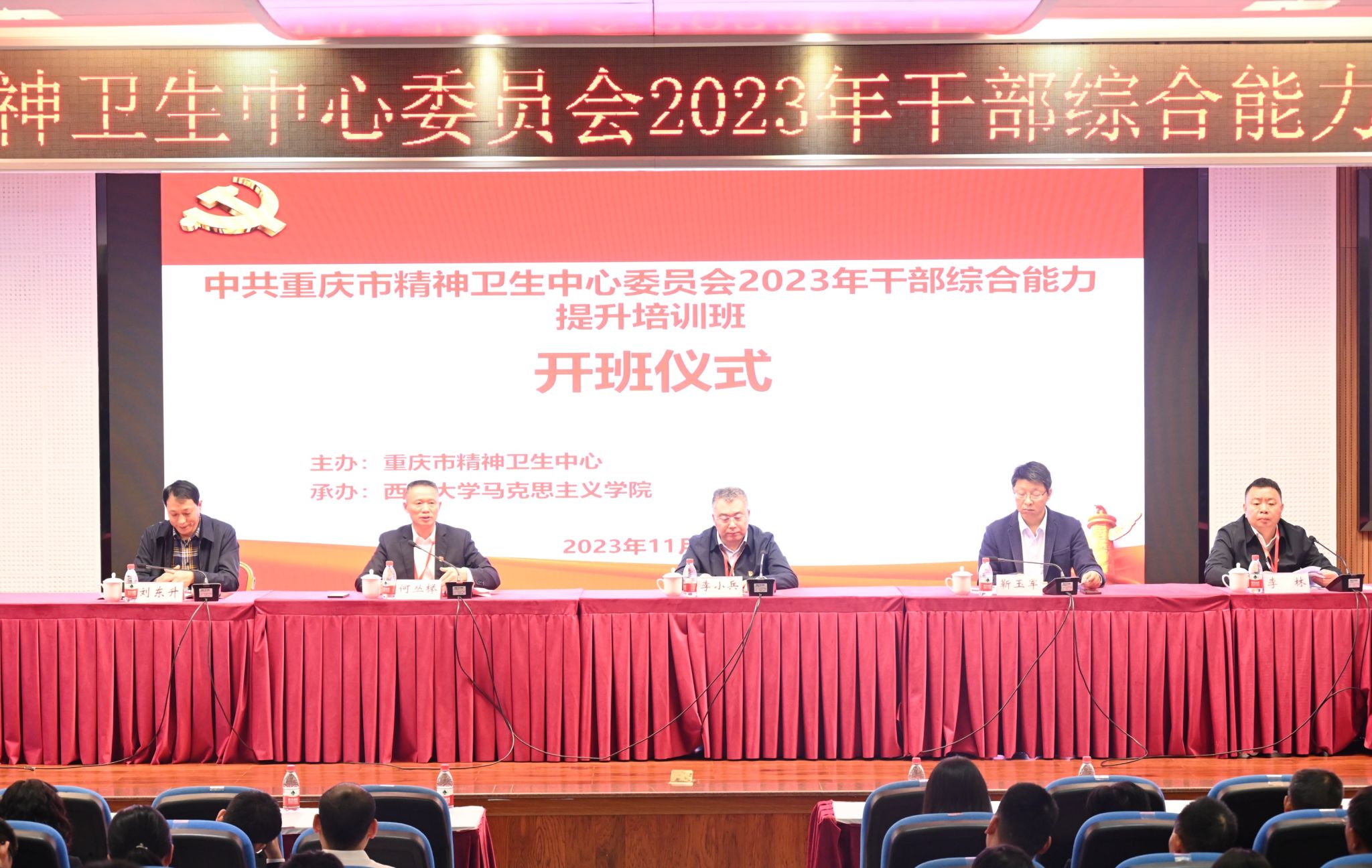 2023年11月8日下午,中共重庆市精神卫生中心委员会2023年干部综合能力提升培训班在必赢3003no1线路检测中心必赢3003no1线路检测中心505多功能会议厅顺利开班。重庆市精神卫生中心党委书记李小兵、重庆市精神卫生中心党委专职副书记何丛榉、重庆市精神卫生中心党委委员、纪委书记李林、必赢3003no1线路检测中心必赢3003no1线路检测中心副院长、教育部高校思政工作队伍培训研修中心(必赢3003no1线路检测中心)主任靳玉军出席本次开班,必赢3003no1线路检测中心必赢3003no1线路检测中心党委副书记刘东升主持开班仪式。