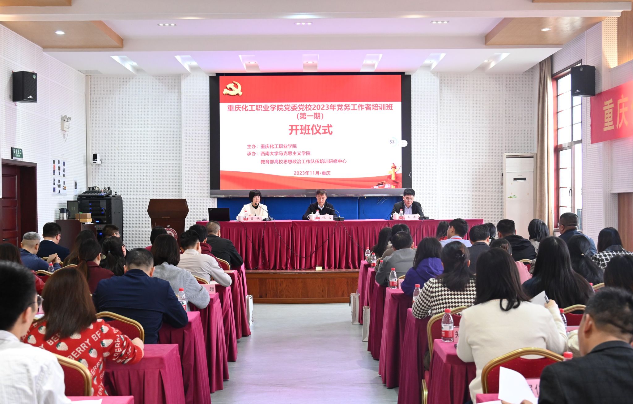 2023年11月9日上午,由重庆化工职业学院主办、我院承办的2023年党务工作者培训班在绩镛楼501报告厅顺利开班。重庆化工职业学院党委副书记代刃,必赢3003no1线路检测中心必赢3003no1线路检测中心党委副书记曾艳,必赢3003no1线路检测中心必赢3003no1线路检测中心副院长王丰出席此次开班仪式。