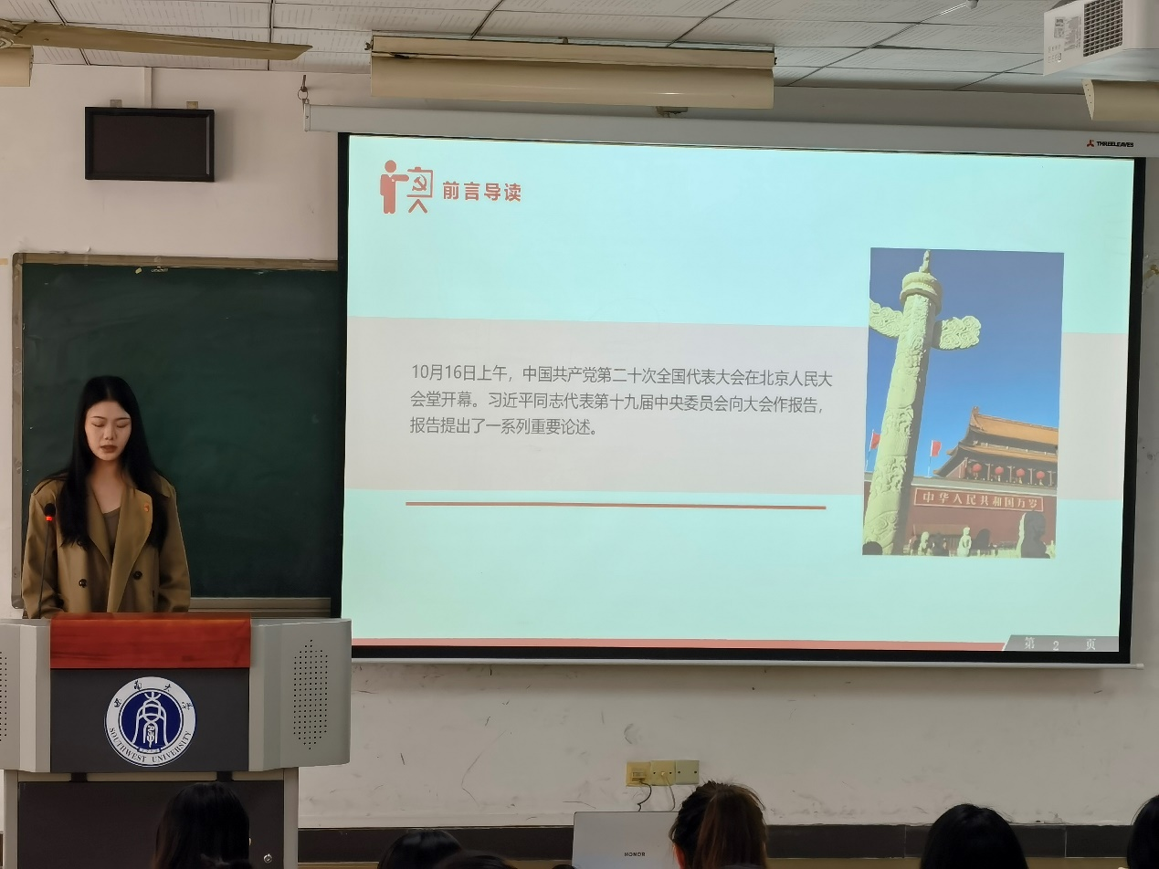 首先,为增进支部新老同志之间的认识和了解,2022级新生党员作自我介绍,支部对新同志们的加入表达了热烈欢迎。随后,高静和代婉盈两位同志先后为大家领学党的二十大报告的内容。代婉盈同志以数字为线索,简明扼要地梳理总结了党的二十大报告的主要内容;高静同志则围绕“坚定”一词展开分享,向大家讲述了老党员们的革命情怀和奉献精神。两位同志的领学让大家深受启发。