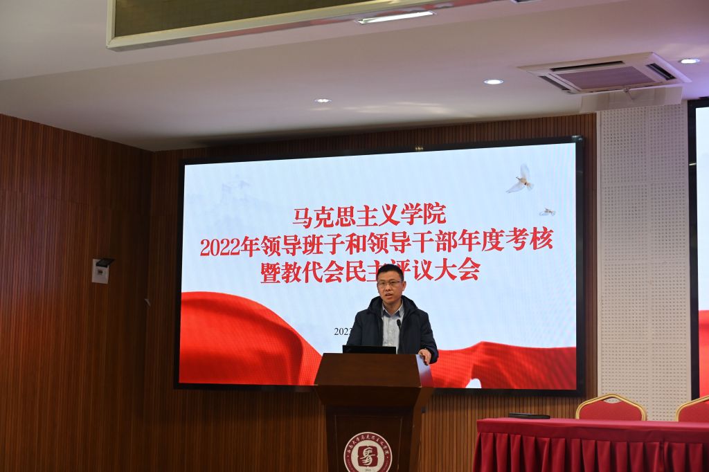 首先,学院党委书记廖晓衡代表领导班子围绕2022年主要工作业绩、工作中存在的主要问题及原因和2023年工作思路进行述职。
