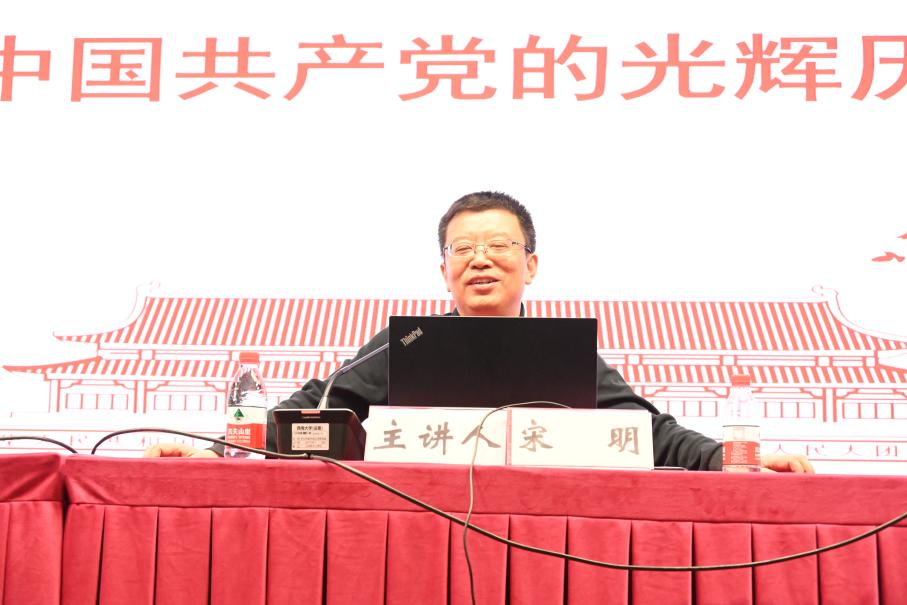 2023年5月12日晚上,学院邀请宋明副教授为培训班学员讲授了题为“中国共产党的光辉历程”的专题党课。宋明副教授以新民主主义革命时期为端,从中国共产党28年的浴血奋战讲到建国伟业;又从“一场战争”讲到推进社会主义革命和建设的重要意义;重点讲解了中国共产党人不忘初心、接续奋斗,以中国式现代化全面推进中华民族伟大复兴,并为大家分享了中国共产党百年奋斗的现实启示。