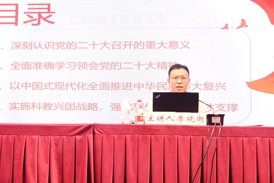 5月21日下午,学院党委书记廖晓衡为全体学员讲授题为“深入学习贯彻党的二十大精神”的专题党课。首先,廖书记向全体学员讲解了党的二十大召开的重大意义。其次,廖书记从全面准确学习领会党的二十大精神、以中国式现代化全面推进中华民族伟大复兴、实施科教兴国战略,强化现代化建设人才支撑三个方面进行了具体讲解。最后,廖书记对学员们提出殷切希望,希望学员们认真、反复研读党的二十大报告原文,全面准确学习领会党的二十大精神,不忘初心、牢记使命,争取早日加入中国共产党。