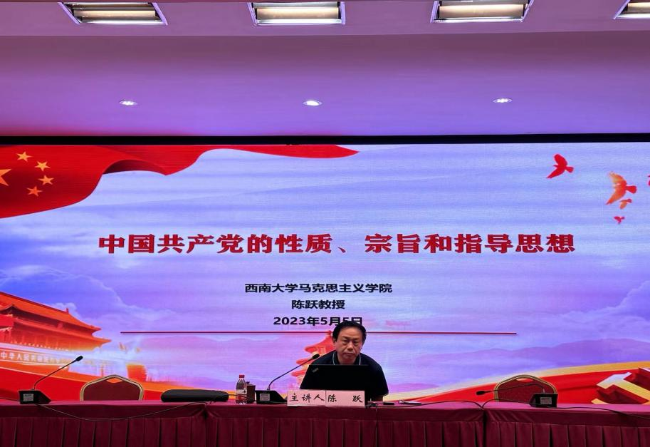 2023年5月14日上午,学院邀请陈跃教授为全体学院讲授题为“中国共产党的性质、宗旨和指导思想”的专题党课。首先,陈跃教授就党的性质进行了讲解。同时为学员们梳理了党的性质表述发展历程。其次,陈跃教授围绕党的指导思想进行了生动的讲述。最后,陈跃教授通过列举中国共产党的优良作风等例子,将党全心全意为人民服务的宗旨讲述得清楚明了。