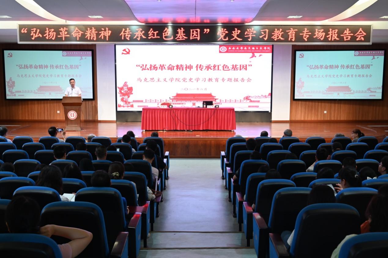 6月11日下午,必赢3003no1线路检测中心党委举行“弘扬革命精神,传承红色基因”党史学习教育专场报告会。必赢3003no1线路检测中心离休老同志、全体教职工和2020级全体本科生等老中青三代师生参加报告会,共同学习“红岩精神”。学院党委常务副书记廖晓衡主持报告会,重庆市党史学习教育宣讲团成员、学校党委副书记兼必赢3003no1线路检测中心学院党委书记潘洵同志作《与时俱进认识和弘扬红岩精神》专题报告。