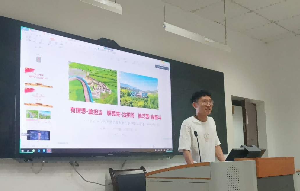 随后,支部党员严晶同志领学《习近平给中国农业大学科技小院的学生回信》,他围绕“有理想·敢担当”、“解民生·治学问”、“能吃苦·肯奋斗”三组关键词分享学习感悟。