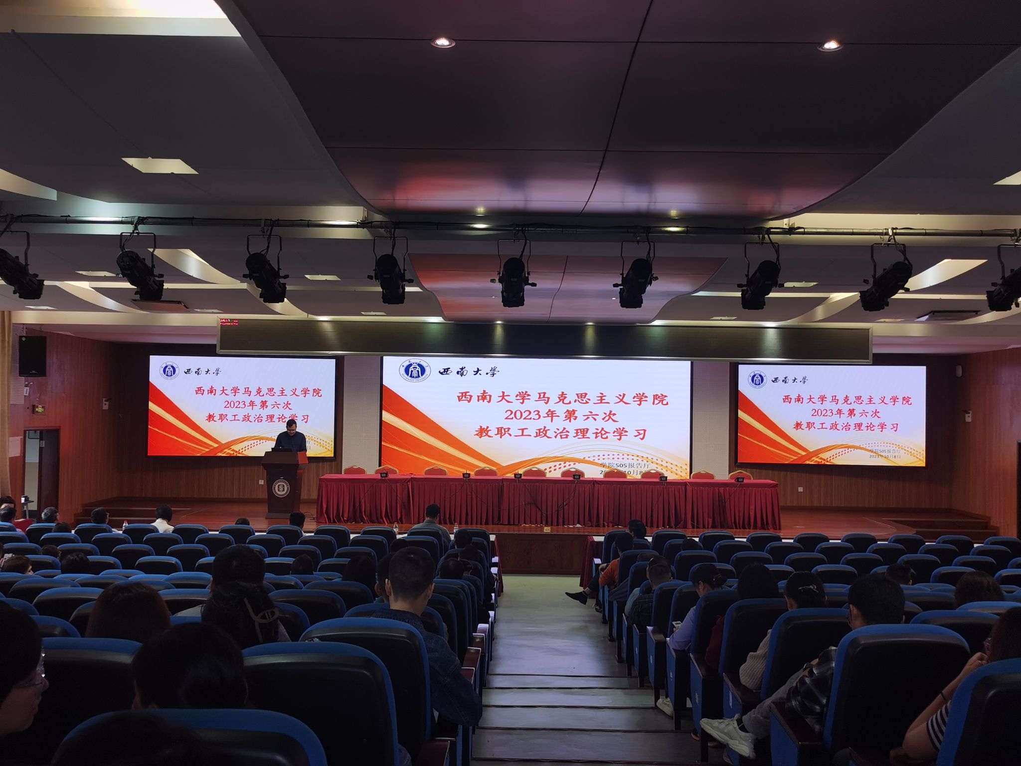 10月8日下午,学院举行2023年度第六次教职工政治理论学习,对习近平总书记关于意识形态工作的重要论述;习近平总书记教师节重要指示精神;“西大教师故事”短视频等内容进行集中学习。学院全体职工参加,会议由学院党委书记廖晓衡主持。