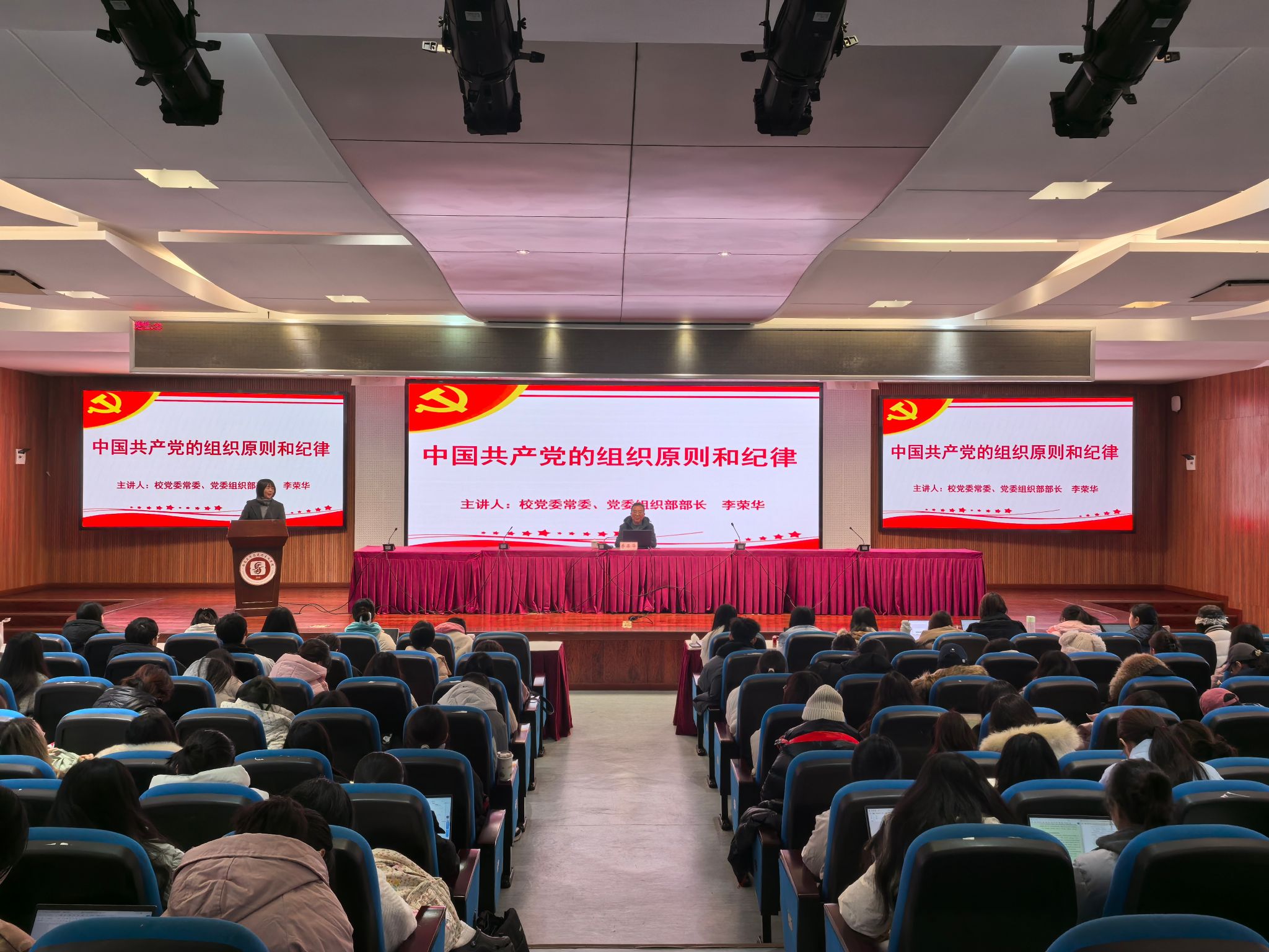 12月15日上午,学校党委常委、党委组织部部长李荣华为全体学员讲授“中国共产党的组织制度和纪律”的专题党课。李荣华部长从“党”的释义出发,系统介绍了党的各级组织,强调中国共产党是具有严密组织体系的整体。围绕民主集中制,从“是什么”“为什么”“怎么做”三个维度,对党的根本组织制度进行了深入讲解。同时详细讲解了党的六大纪律,通过负面清单的形式,使学员们对党的纪律有了更加清晰的认识。最后强调,入党积极分子都要认真学习和理解党的组织和纪律,以优异成绩和突出表现争取早日加入党组织。