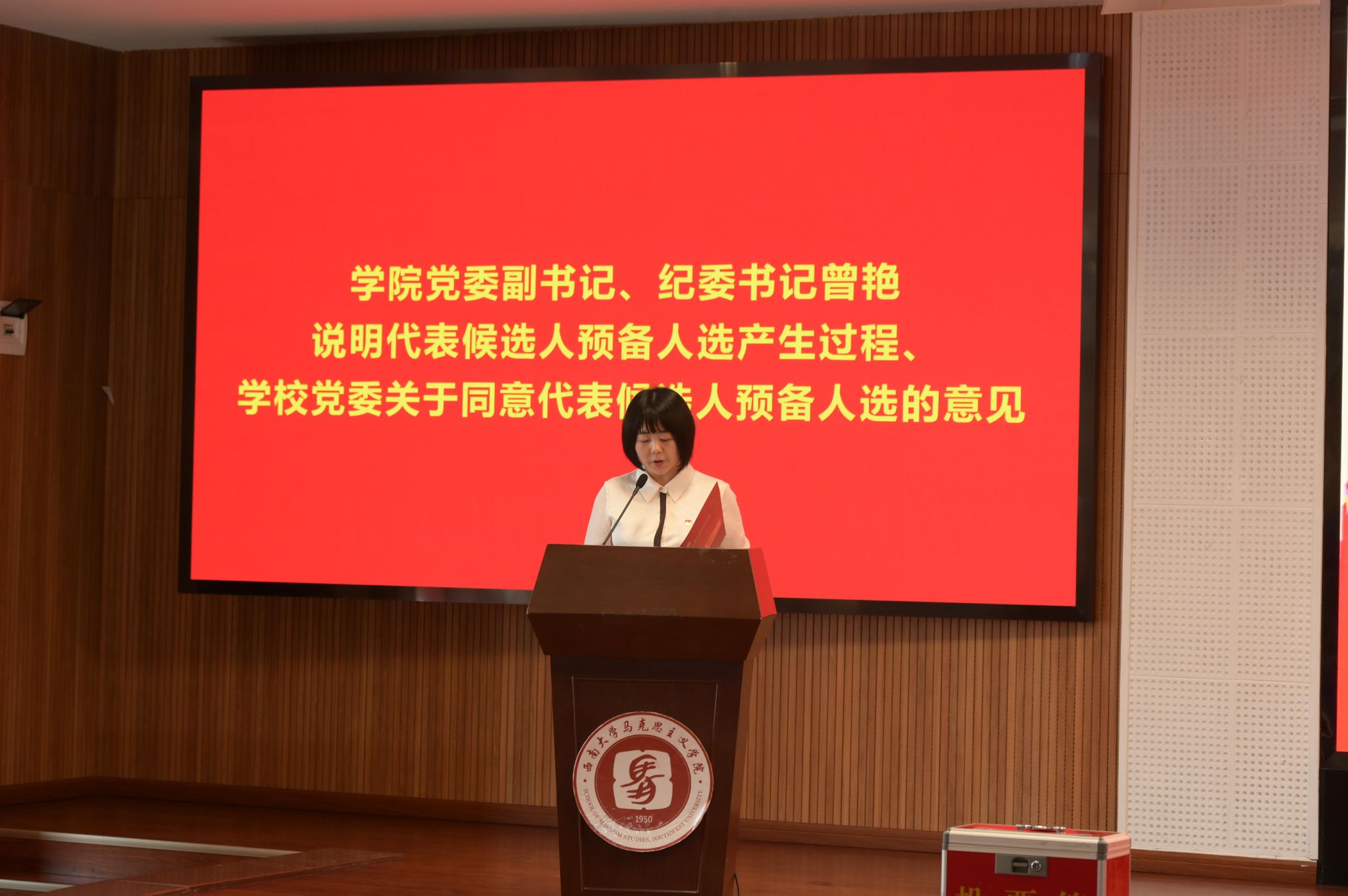学院党委副书记、纪委书记曾艳作代表候选人预备人选产生过程的说明,并说明学校党委关于同意代表候选人预备人选的意见。