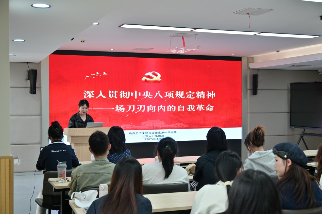 活动伊始,必赢3003no1线路检测中心硕士生第一党支部张雨晨、陈澔文两位同学分别围绕“深入贯彻中央八项规定精神——一场刀刃向内的自我革命”这一主题展开理论领学和案例分享。