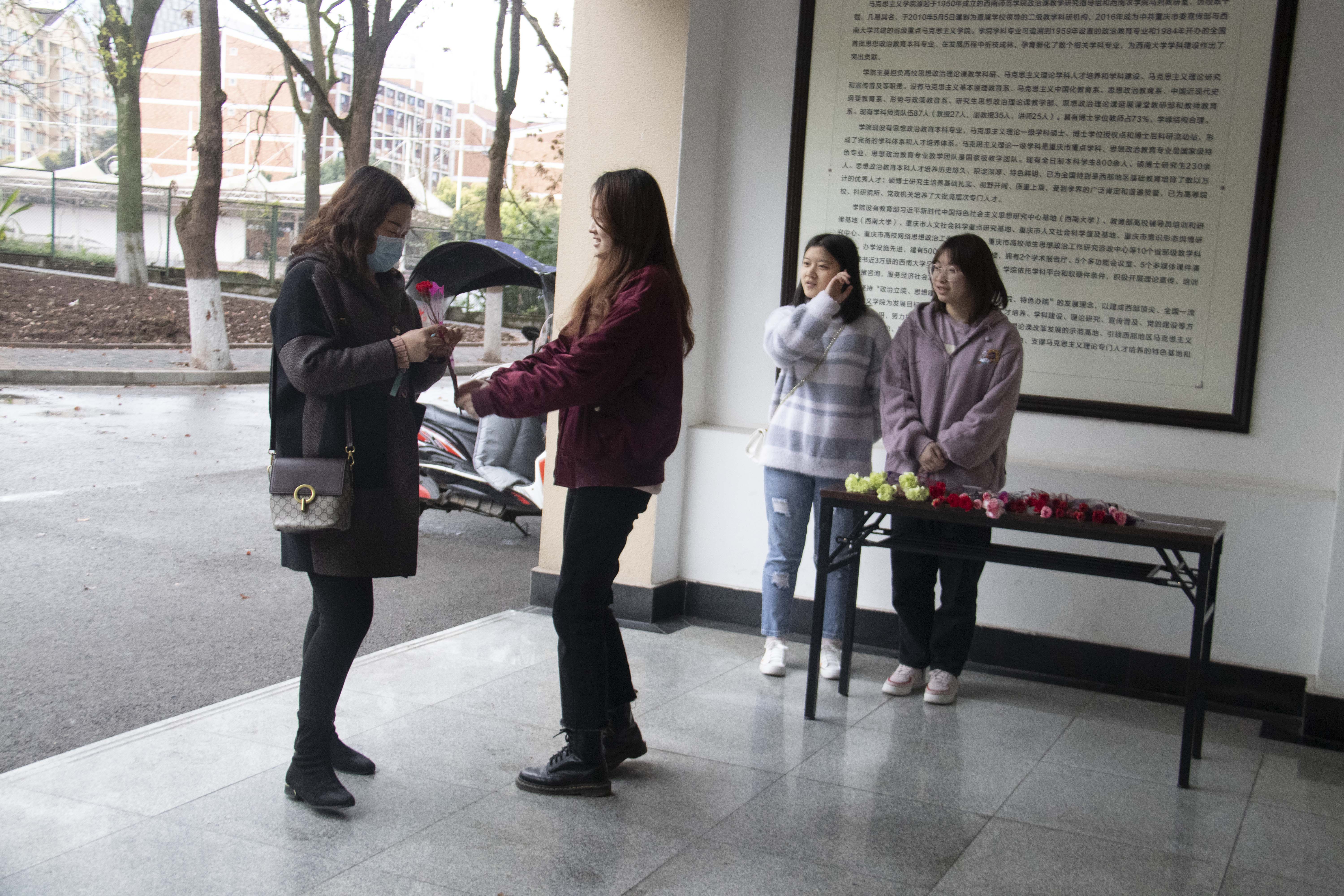 在3月8日上午,学生会工作人员还在马院正门和马院停车场举行了摆点送花的活动,为来往的马院女教师送上了一束鲜花。上课的老师也没落下,下课后会有专门的学生会成员为她们送上鲜花。同学们捧着鲜花,代表学院为我们的女老师送上了真挚的祝福。