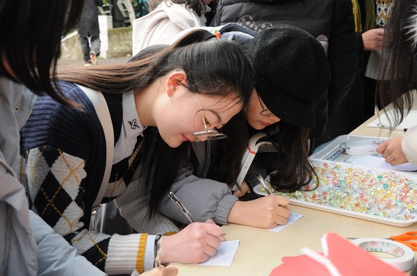 同时在线下进行了摆点活动和班级大比拼。3月7日,马院侧门开展“言为心声 志盈心满——圈套心愿”活动,同学们写下心愿,并掷纸环套杯子,得到礼品同时满足他人的心愿。每一个小小的心愿的实现,都是一份真心与友爱的传递。