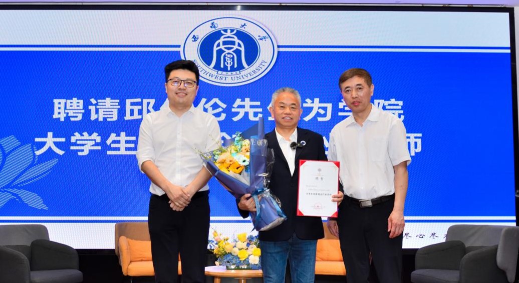 为更好的助力学子成长成才,学院特聘请邱代伦学长为学院大学生创新创业行业导师,由潘洵院长与学院党委书记吴文杰为其颁发聘书。