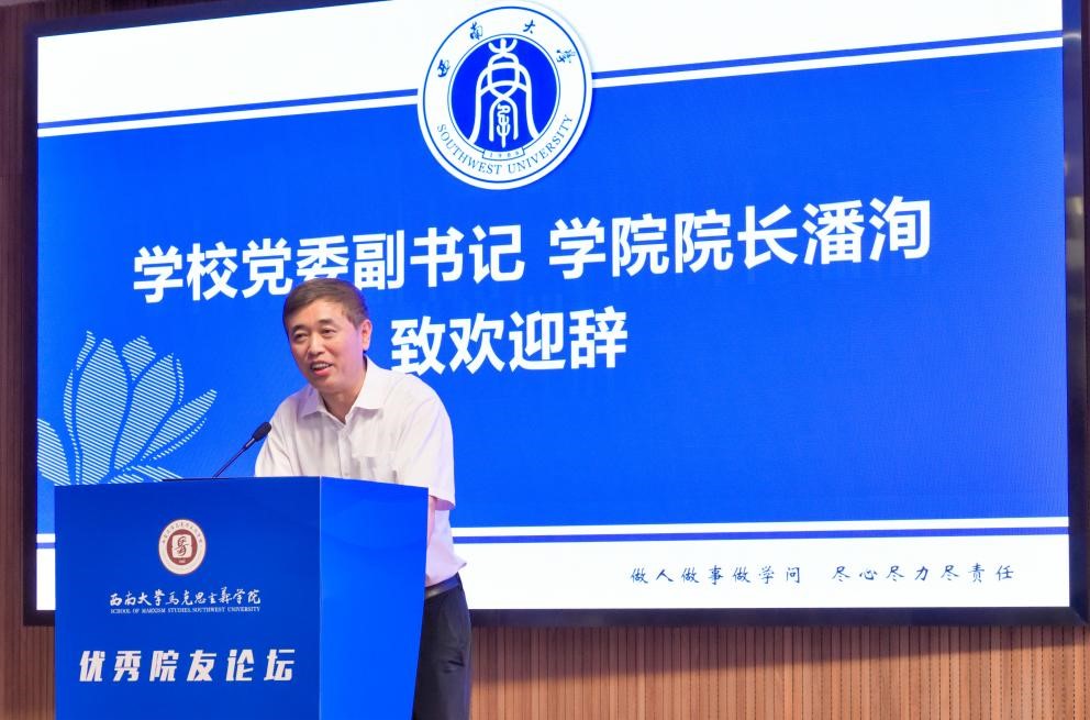 学校党委副书记、学院院长潘洵首先在致辞中对邱代伦的到来表示热烈欢迎。潘书记指出,学院在高质量发展过程中,高度重视校友工作,注重以榜样的力量培育时代新人。数十载光阴里,学院见证了无数学子的成长与辉煌,或立足行业前沿,引领时代浪潮,或热心公益事业,传递人间真情,学子的每份成就都是学院最珍贵的荣光。当前,学院已将“筹备成立必赢3003no1线路检测中心校友会”列为学院重点工作之一。举办“优秀院友论坛”,正是希望通过邀请躬耕于国家各个领域发展前沿战线的优秀院友“回家”传经送宝,倾听优秀院友的成长故事与行业洞见、最新的建设成果与未来规划,以此搭建引领学生多元成长平台,赋能学生全面成长,让“院友力量”成为学院高质量发展的坚实后盾。