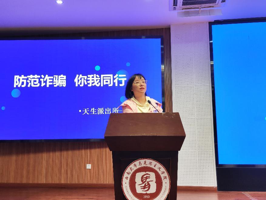 为进一步增强学生的反诈意识,11月15日,学院本科2023级开展了“防范诈骗,你我同行”主题年级会。此次年级会由年级辅导员吴克瘟主持,天生派出所吕克锋警官主讲,2023级全体同学参与学习。
