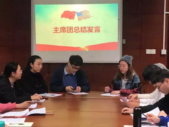 首先,全团一起观看了“你对中美贸易战有何看法”的街头视频采访视频。紧接着团学活动部和学研部的部员赵红梅和苏扬媚分别讲述了中美关系的历史回顾和中美贸易战打响的事件始末,娓娓道来,层层分析,让团员们深刻地了解中美历史关系的演变以及中美贸易战的背景和发生原因。