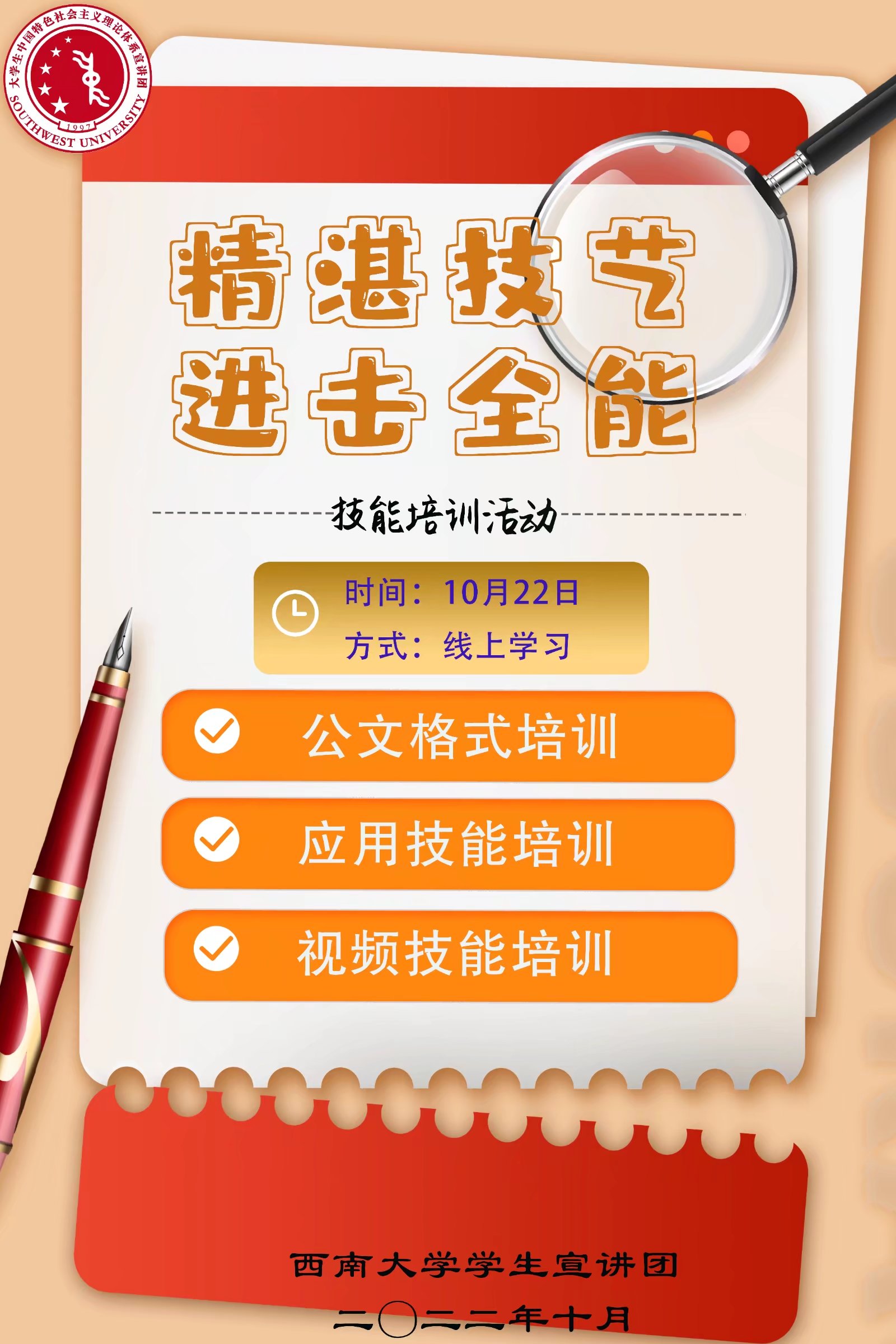 10月21日,“笔落惊风雨,文成若锦粲”公文写作培训暨“精湛技艺,进击全能”应用技能培训利用资料包学习与视频学习相结合的方式在线上开展。从规范公文格式到制作演示文稿和剪辑视频,从版面美化到操作技巧,培训内容实用丰富,重点强调突出,难点讲解细致,小宣人们都收获满满。除此以外,本次公文写作暨应用技能培训还精心设计了线上试题,以便更好地对新团员的学习成果进行查收和检验,真正做到了学可循迹,学有所得。