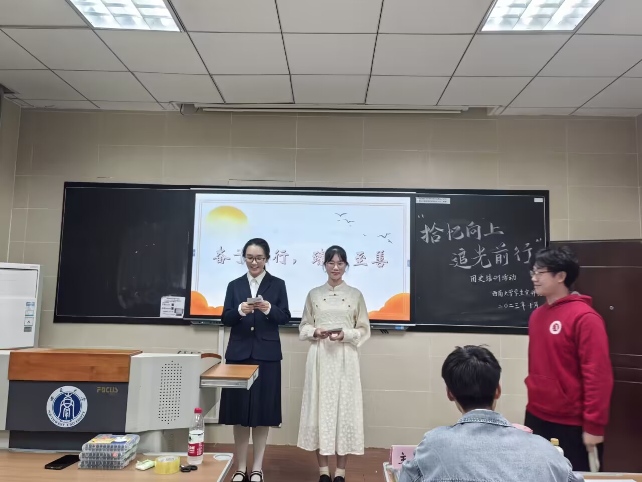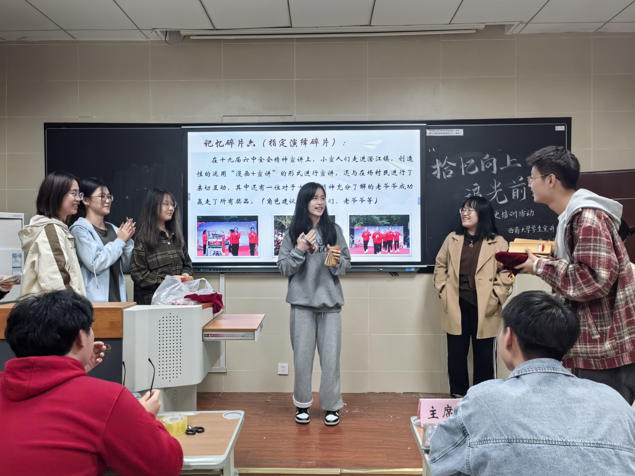 10月27日晚,在国家治理学院3110,“拾忆向上,追光前行”团史培训活动顺利开展。小宣人们在小团子及其朋友的带领下,通过团史知识竞答的方式,帮助失忆的思铭寻找承载着学生宣讲团过往点滴的“记忆碎片”。同时,新团员们也在演绎一个个“记忆碎片”里感悟学生宣讲团的光辉历史,在聆听师兄师姐们的暖心寄语中明确身份担当,在“以笔传情”部门形象绘制环节中了解各部门的职能特色。岁月如歌,往事成碑,前路漫漫,齐心向前。相信新一届小宣人必将以青春为帆、以理论为桨,在学生宣讲团的新征程上乘风破浪、砥砺前行!