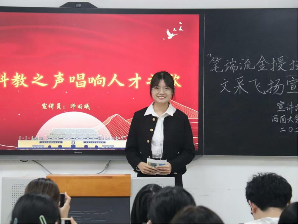 10月29日22:10,“笔端流金授技艺,文采飞扬宣宏图”宣讲技能培训活动在马院研二教室举办。师雨曦师姐带来示范宣讲《让科教之声唱响人才之声》;快板舞表演彰显宣讲魅力。本活动涵盖宣讲、撰稿、快板三方面的培训,以“打板传花”收尾,小宣人们受益匪浅。