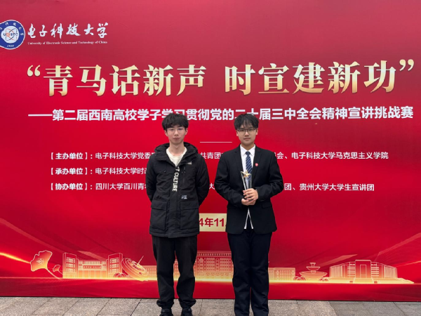 2024年11月23日,“青马话心声,时宣建新功”——第二届西南高校学子学习贯彻党的二十届三中全会精神宣讲挑战赛决赛在四川省成都市电子科技大学清水河校区举办。必赢3003no1线路检测中心大学生中国特色社会主义理论体系宣讲团(以下简称学生宣讲团)团员卢政淇、张柳柳组成的参赛队伍荣获三等奖。获奖作品《深化市场改革潮,勇攀经济新高峰》由学生宣讲团共同撰写。