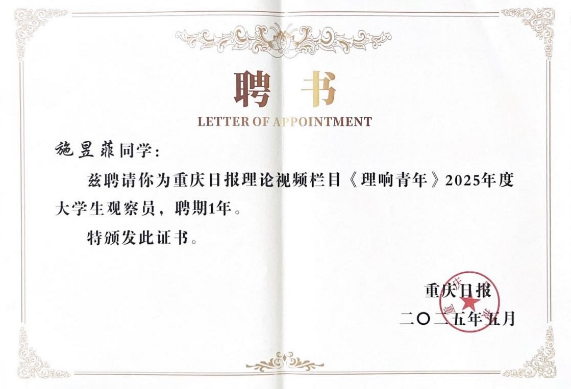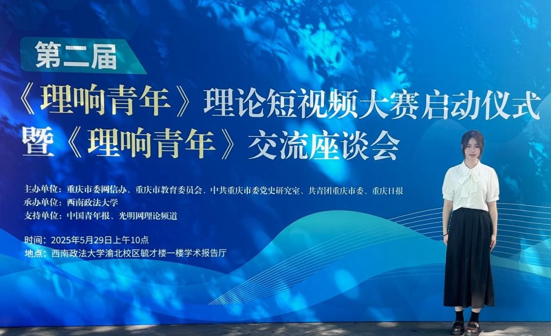 2025年5月29日,第二届《理响青年》理论短视频大赛启动仪式暨《理响青年》交流座谈会在西南政法大学成功举办。该论坛由重庆市委网信办、重庆市教育委员会、中共重庆市委党史研究室、共青团重庆市委、重庆日报联合主办。必赢3003no1线路检测中心大学生中国特色社会主义理论体系宣讲团(以下简称“学生宣讲团”)团员施昱菲受邀参会并获聘为大学生观察员。