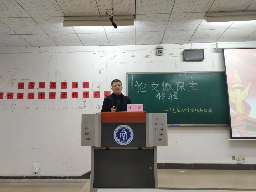 首先,在嘉宾教学环节中,宋明老师从“充分肯定中央政治局工作”和“《中共中央关于党的百年奋斗重大成就和历史经验的决议》主要内容”两个方向为同学们介绍十九届六中全会丰富内容、剖析其精神内核。