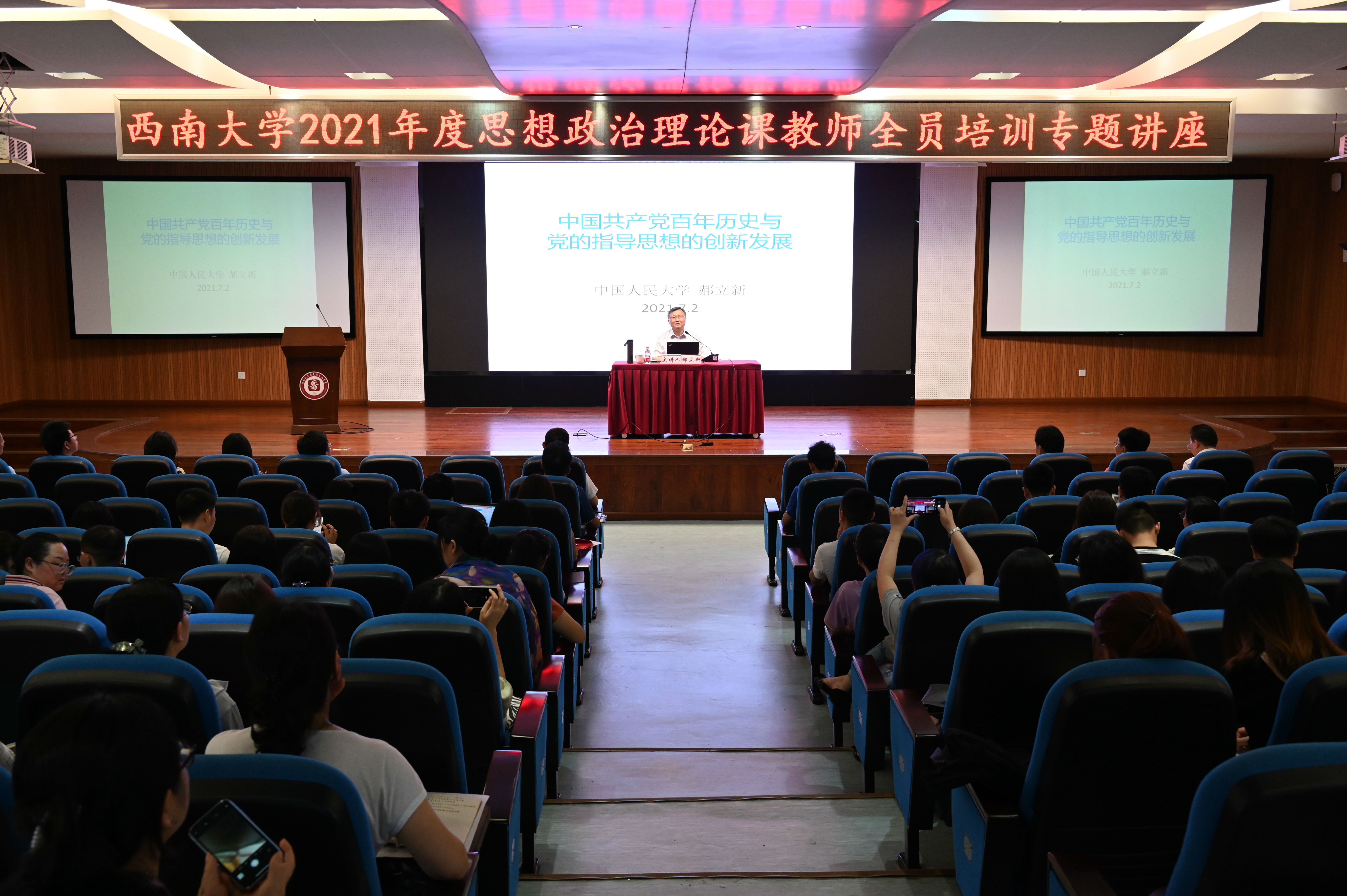 为深入贯彻落实学习习近平总书记在庆祝中国共产党成立100周年大会上的重要讲话精神,同时切实加强学校思政课教师队伍建设,学校举办2025 版权所有:bwin·必赢(3003no1-中国)线路检测中心|Official website年度思想政治理论课专兼职教师全员培训专题讲座。2025 版权所有:bwin·必赢(3003no1-中国)线路检测中心|Official website年7月2日下午在必赢3003no1线路检测中心505学术报告厅邀请学校党委宣传部部长李荣华做“风雨兼程百年路,不忘初心再出发”主题导学,随后,中国人民大学郝立新教授以“中国共产党百年历史与党的指导思想的创新发展”为题进行了专题讲座。培训由必赢3003no1线路检测中心党委常务副书记廖晓衡主持,学校全体专兼职思想政治理论课教师参加。