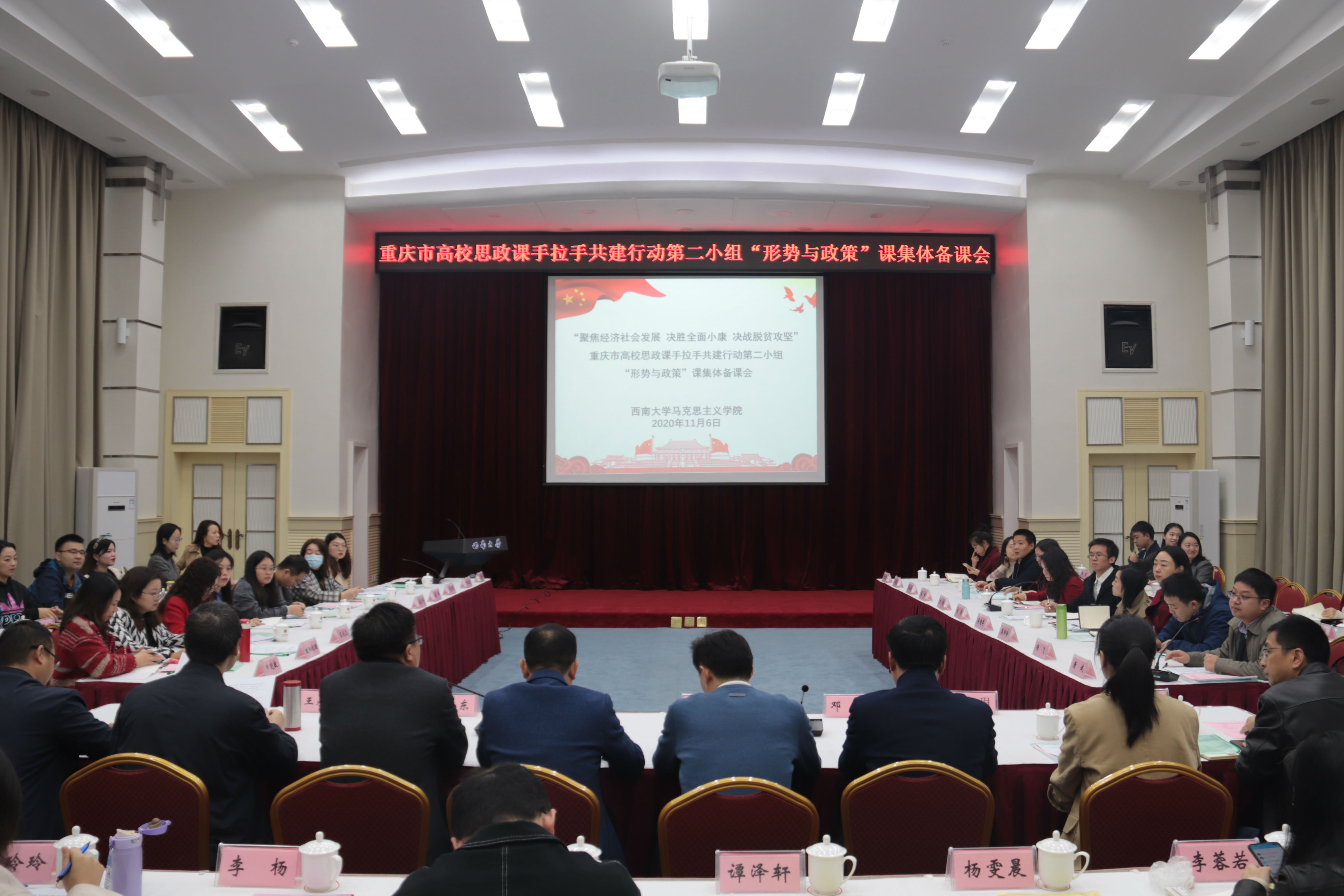 11月6日,重庆市高校思政课手拉手共建行动第二小组“形势与政策”课集体备课会在必赢3003no1线路检测中心桂园宾馆金桂厅举行。来自必赢3003no1线路检测中心、西南政法大学、四川外国语大学南方翻译学院、重庆工业职业技术学院、重庆青年职业技术学院、重庆航天职业技术学院等单位近80余位“形势与政策”课教师莅临会议。会议由必赢3003no1线路检测中心必赢3003no1线路检测中心副院长吴艳东教授主持。