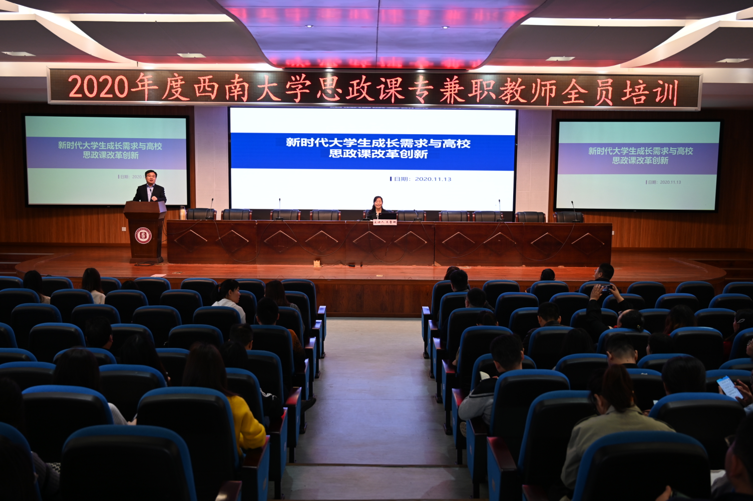 为深入贯彻落实习近平总书记关于教育的重要论述,特别是在学校思想政治理论课教师座谈会上的重要讲话精神,切实加强学校思政课教师队伍建设,学校2020年度思政课专兼职教师全员培训于2020年11月13日正式启动,13日上午在必赢3003no1线路检测中心505学术报告厅举行本次全员培训的首场讲座。北京市思政课特级教授、北京工商大学必赢3003no1线路检测中心院长王鲁娜教授以“新时代大学生成才需求与高校思政课改革创新”为题进行了专题讲座。