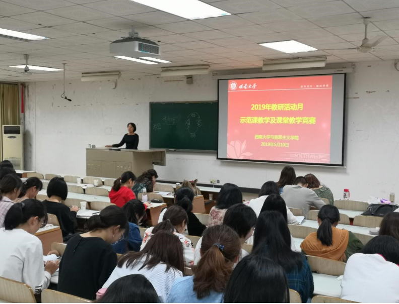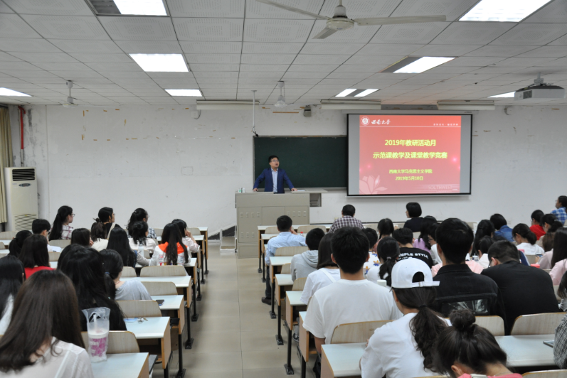 此次活动由马克思主义副院长吴艳东教授主持,邀请张国镛、邹绍清、文红梅三位老师担任评委。学院全体教师和本科17级、18级部分同学参加并观摩与学习。学校原党委书记,必赢3003no1线路检测中心黄蓉生教授也莅临会场指导观摩此次活动。此次活动分为两个环节,一是示范课教学环节;二是教学竞赛环节。首先,文红梅老师应邀为全体老师讲授示范课,文老师声情并茂用大量的历史史实,通过多媒体、启发式、提问式教学以及生动的语言和端庄的教态呈现了“唤起民众千百万——中国共产党领导下的新民主主义革命之中华民族抗日战争”的教学重点:昭昭前事,惕惕后人。史论结合的授课方式,使得历史知识讲授与价值引领有机结合,让在座的老师们受益匪浅。