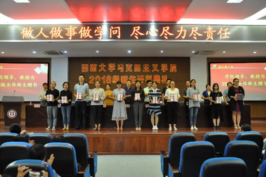 值得一提的是学院特色赠书环节,学院领导、教授分别为2018级博士生、硕士研究生以及本科生赠送《马克思恩格斯选集》、《毛泽东选集》以及《共产党宣言》,坚持贯彻马院学子要“多读书,读好书”的理念。“生命不止,奋斗不息”、“命运掌握在自己手中”……这一声声寄语是老师们对新生的殷切期盼。恰逢教师节到来之际,典礼中特设学生代表向教师献花环节,以此感谢师恩、祝福老师。