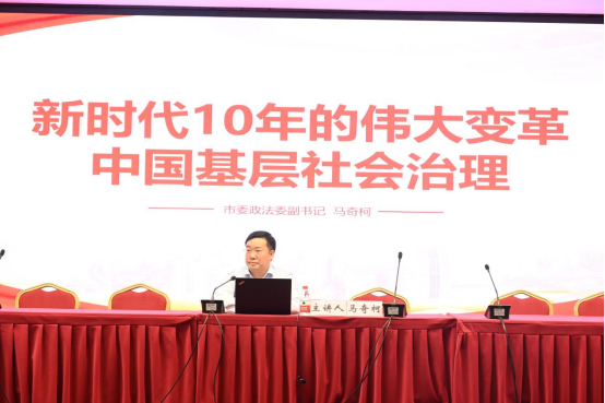 马奇柯副书记紧密围绕“新时代10年的伟大变革:中国基层社会治理”这一主题,从六个方面深入浅出、有理有据的讲解了十八大以来我国在基层治理领域的伟大成就和经验。一是要明确治国安邦重在基层,必须把抓基层、打基础作为长远之计和固本之策,坚持牢固树立大抓基层的鲜明导向。二是要坚持和完善中国特色社会主义制度,推进国家治理体系和治理能力现代化,完善社会治理体系,坚持共建共治共享,建设人人有责、人人尽责、人人享有的基层治理共同体。三是坚持总体国家安全观,坚持稳中求进工作总基调,统筹国内国际两个大局,统筹发展和安全,实现高质量发展和高水平安全良性互动。四是要坚持党的领导、人民当家作主、依法治国的有机统一,健全党组织领导的自治、法治、德治相结合的城乡基层治理体系。五是要坚持以人民为中心的发展思想,提高保障和改善民生水平,不断促进社会公平正义,使人民获得感、幸福感、安全感更加充实、更有保障、更可持续。六是坚持和发展新时代“枫桥”经验,坚持专项治理、系统治理、依法治理、综合治理、源头治理的有机统一,着力推进社会治理系统化、科学化、智能化、法治化,健全社会矛盾纠纷多元预防调处化解机制,有效预防和化解社会矛盾。