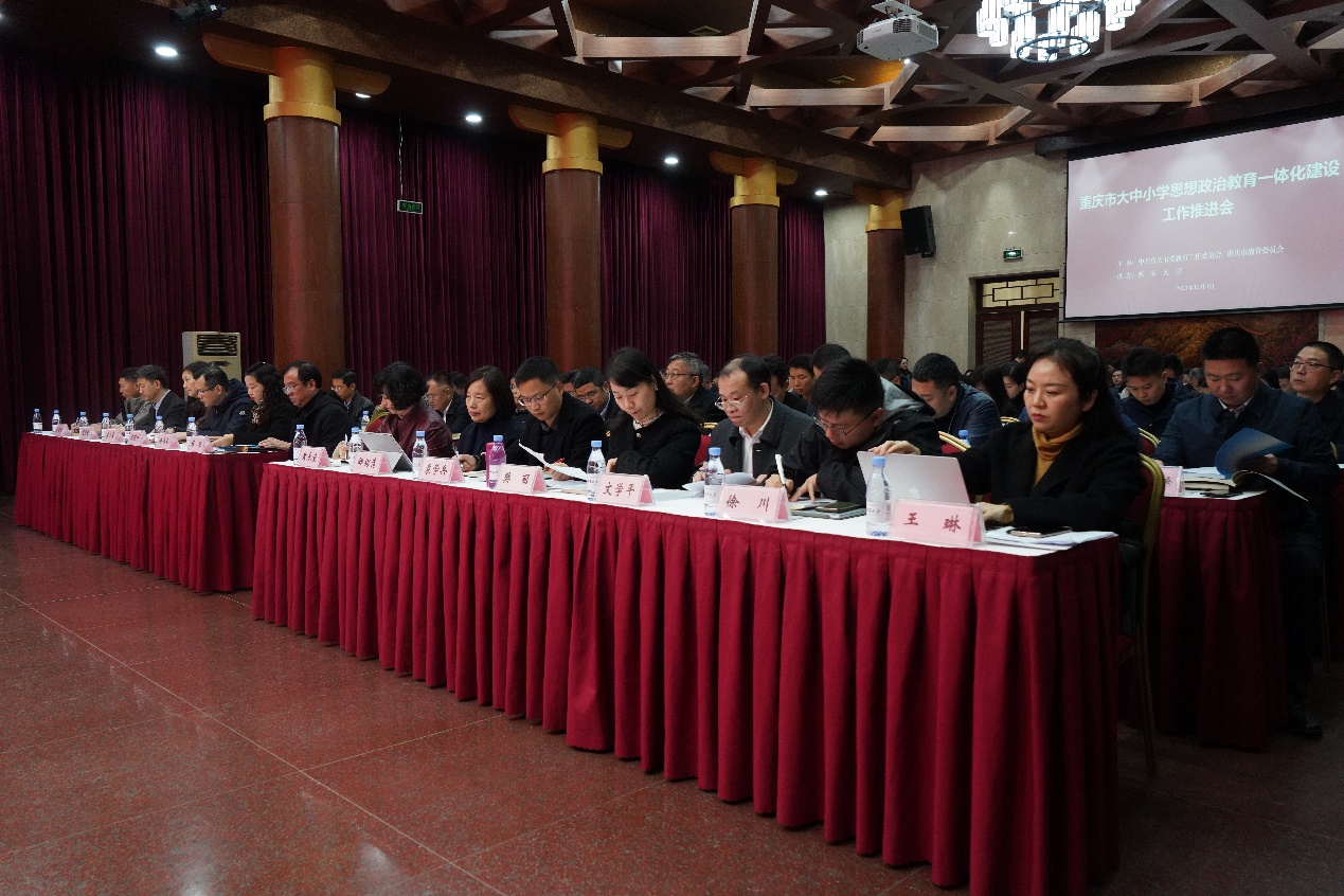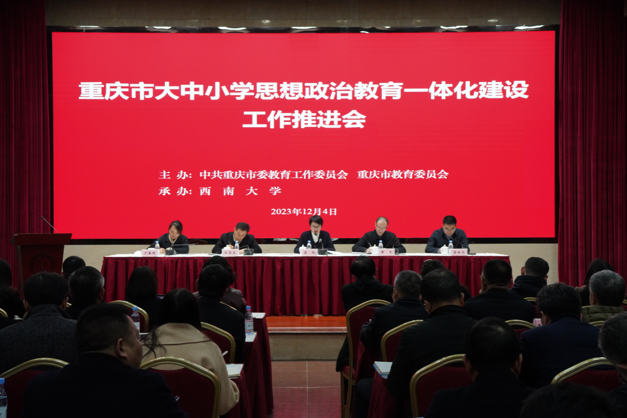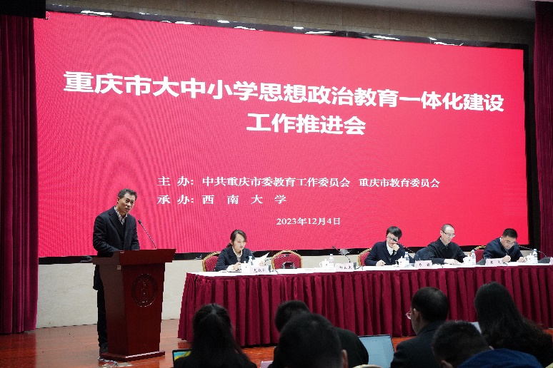 为深入学习贯彻习近平新时代中国特色社会主义思想和党的二十大精神,贯彻落实全国大中小学思想政治教育一体化战略研讨会精神,推进大中小学思想政治教育一体化建设,2023年12月4日,由中共重庆市委教育工作委员会、重庆市教育委员会主办,必赢3003no1线路检测中心承办的重庆市大中小学思想政治教育一体化建设工作推进会顺利召开。市委教育工委专职副书记屈锐出席会议并讲话。我校是教育部大中小学思政课一体化建设共同体重庆市的牵头单位,学校党委副书记黄杰出席会议并致辞。会议由重庆市教委宣教处处长李林齐主持。