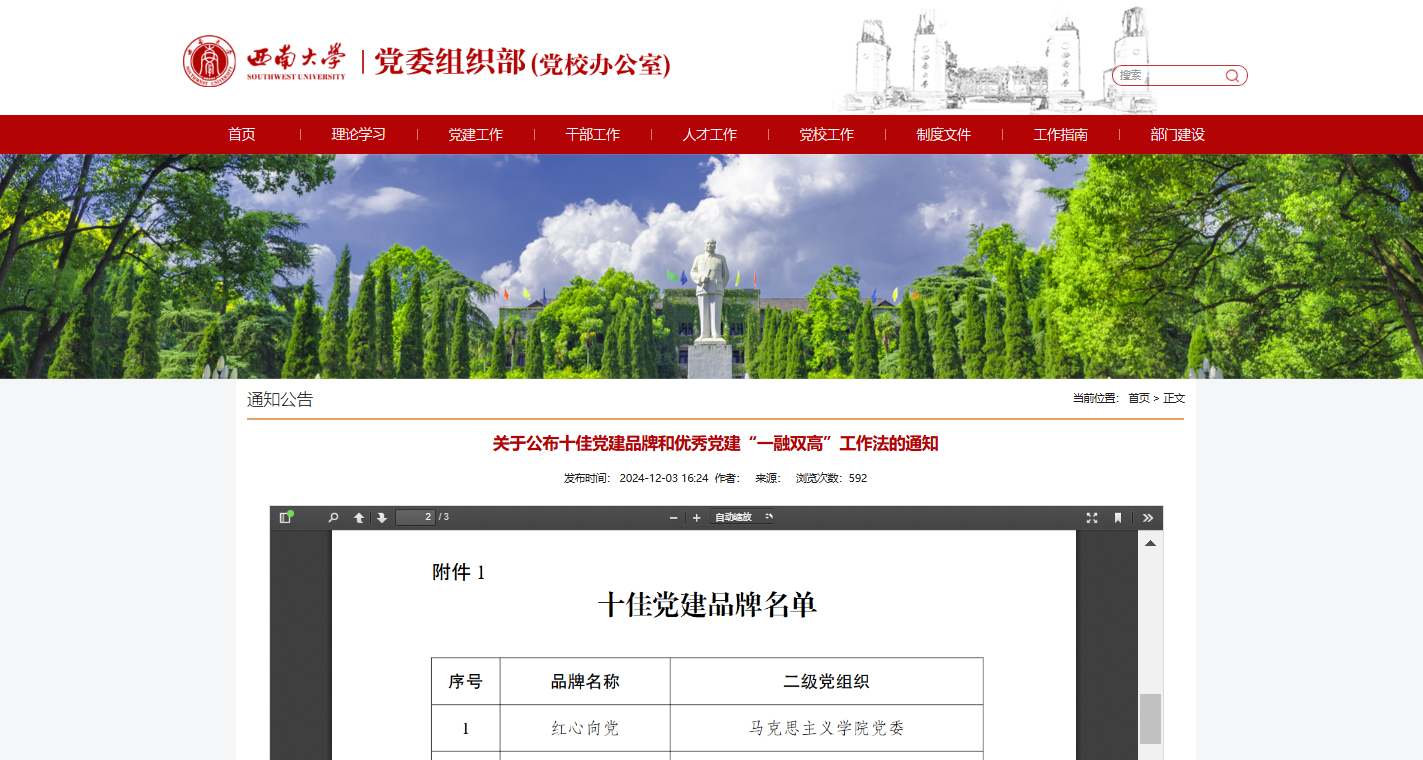 三是抓思政聚合力。扎实推进“红岩精神铸魂时代新人”,获批全国辅导员名师工作室,入选高校思政工作研究文库、教育部红色文化弘扬基地。承办共产党人家风档案展。建立健全教师思想政治和师德师风建设工作组,拟定年度工作计划,常态化开展思政课教师实践研修,师德师风警示教育,严把教师思政和师德师风考核关。提升党建带团建群建效能,学院党委定期研究共青团工作,工会、教代会工作和统战工作,组织召开学代会,组织开展青年教师座谈会、荣休仪式等关注教师发展,重阳节慰问关爱离退休教师,营造关爱师生的良好氛围。