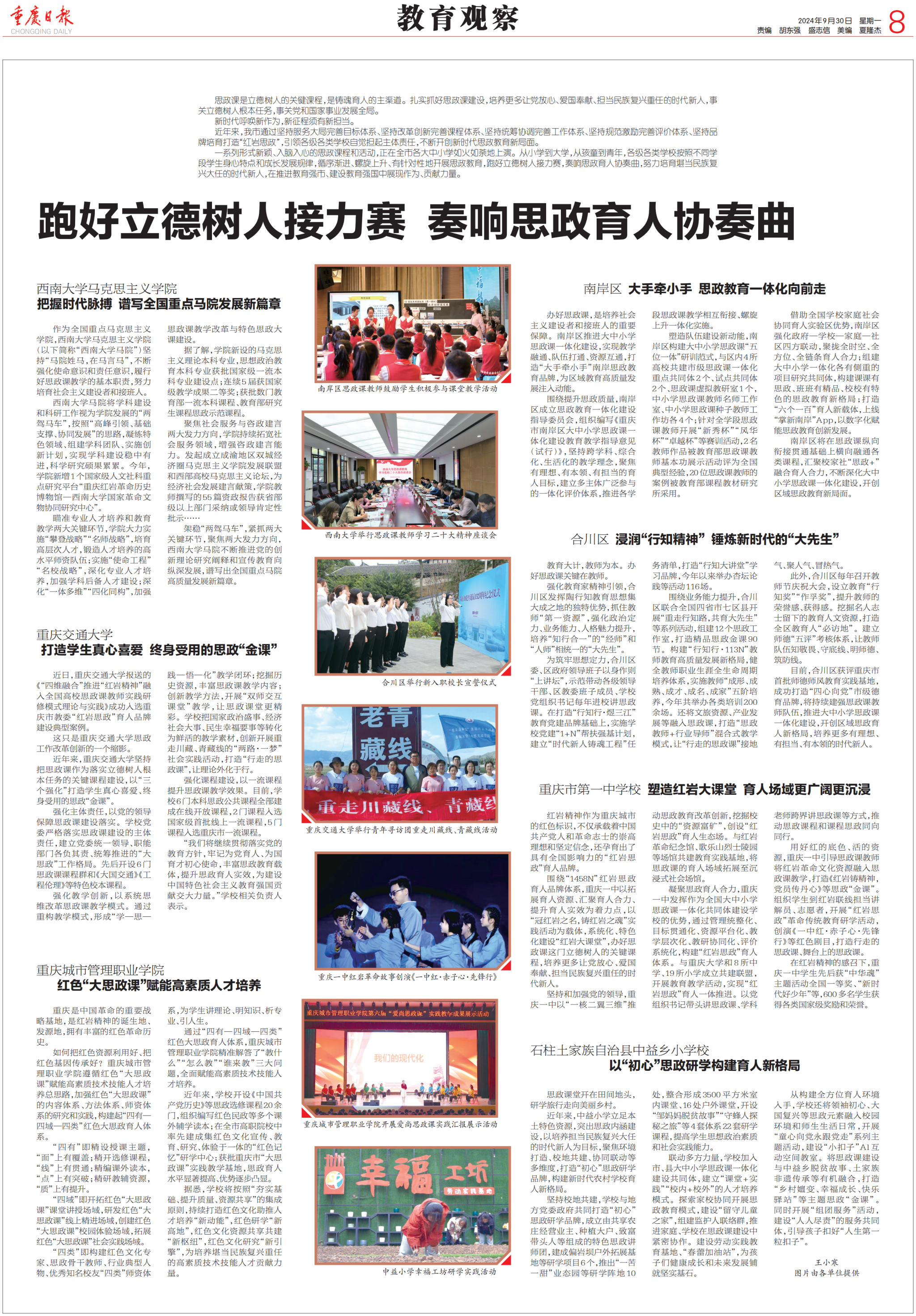 一是抓政治强引领。筑牢学习宣传党的创新理论“主阵地”,组织党委会、党政联席会“第一议题”“跟进学”,党委中心组、领导干部读书班“深度学”,思政课教师、学生代表、科研团队座谈会“研讨学”;组建“专家、青年教师、大学生”三级宣讲队伍,1人入选全国“中国共产党人精神谱系”宣讲团,2人入选党的二十届三中全会精神重庆市委宣讲团,青年师生到学校、社区、企业等宣讲40余场;申报党的二十届三中全会精神研究阐释专项10余项,在《人民日报》《光明日报》等发表理论文章20余篇。上好党纪学习教育“必修课”,组织召开警示教育大会,开展党纪学习教育融入思想政治理论课教学专题研讨,微信公众号推出“‘纪’忆犹新”栏目,以跨校交流、实地研学、纪律党课等不断丰富形式、提升实效。