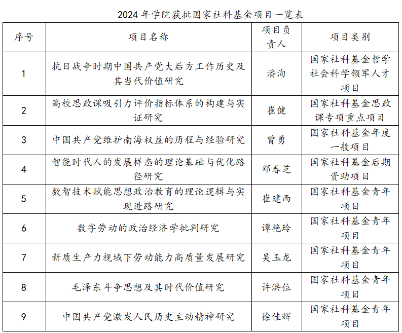 2024年度,学院教师获批省部级以上科研项目39项,其中国家社科基金项目9项,包括国家社科基金哲社领军人才项目1项,国家社科基金思政课专项重点项目1项。潘洵教授主持的国家社会科学基金重大研究专项“抗美援朝战争口述资料采录与整理”获滚动资助40万。黄蓉生教授获批教育部哲学社会科学研究重大课题攻关委托项目“推进马克思主义中国化时代化研究”。
