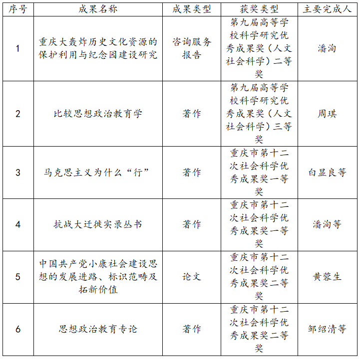2项成果分获第九届高等学校科学研究优秀成果奖(人文社会科学)二等奖、三等奖;4项成果获重庆市第十二次社会科学优秀成果奖,其中一等奖2项,二等奖2项;何玲玲教授成果《马克思主义大众化的百年历程及基本经验研究》入选2024年度高校思想政治工作研究文库。