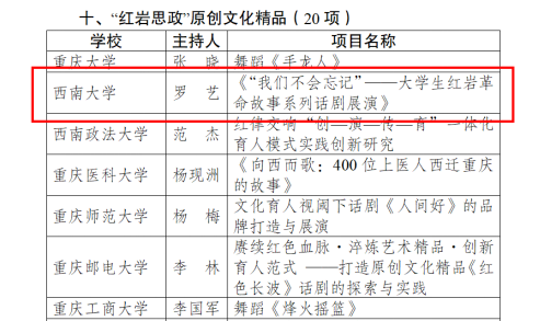 近日,重庆市教育委员会发布《2025年重庆市高校思想政治工作质量提升项目入选名单》,经学校推荐、专家评审、网上公示等环节的严格遴选,我院申报的《“我们不会忘记”——大学生红岩革命故事系列话剧展演》成功入选“红岩思政”原创文化精品项目。