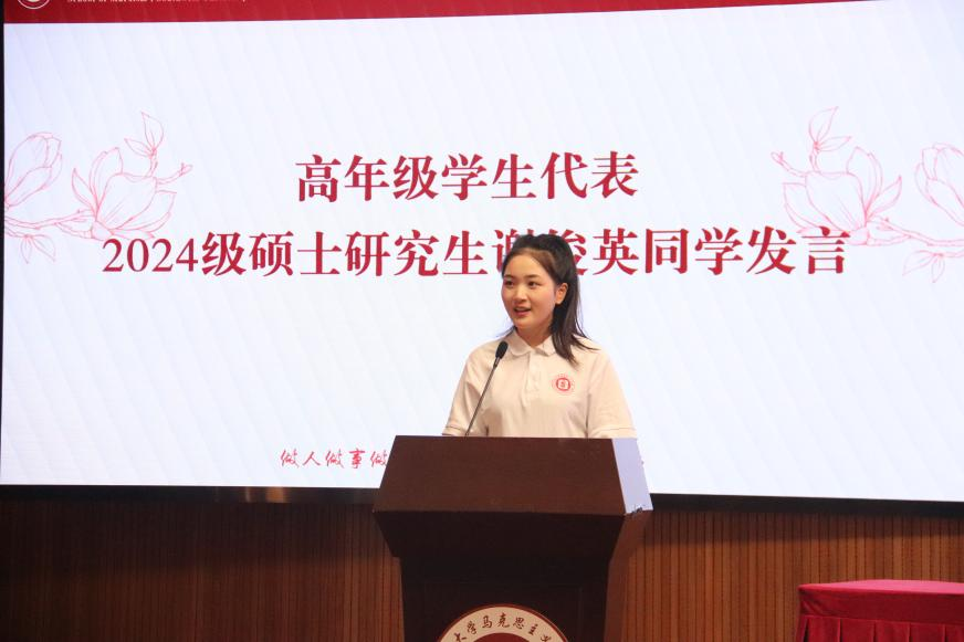 2024级研究生代表谢俊英以“三个一”与同学们共勉:一颗向真向行的赤子心、一股躬身实干的精气神、一种逐浪争先的进取心,并发出“以青春之名,赴真理之约”的宣言。