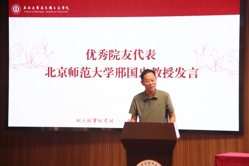 优秀院友代表北京师范大学邢国忠教授发言,他以“坚持锻炼”“保持定力”“培养情怀”三个关键词勉励在场同学。他指出,良好的身体状态是学习与科研的前提,面对社会焦虑要保持清醒,专注做正确的事;同时,他强调马院学子应树立家国与教育双重情怀,将个人发展与时代大势相连,在学术与人生道路上走得更稳、更远。