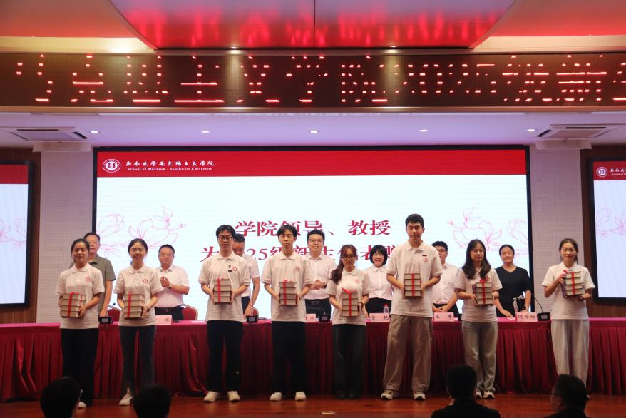 学院领导、教授为2025级新生代表赠书,研究生代表和本科生代表依次上台领取赠书。学院为每位本科生准备了《共产党宣言》,为研究生准备的是一套《马克思恩格斯选集》(全4卷),一本本著作饱含着学院希望同学们用经典涵养正气、淬炼思想、升华境界、指导实践的殷切期盼。