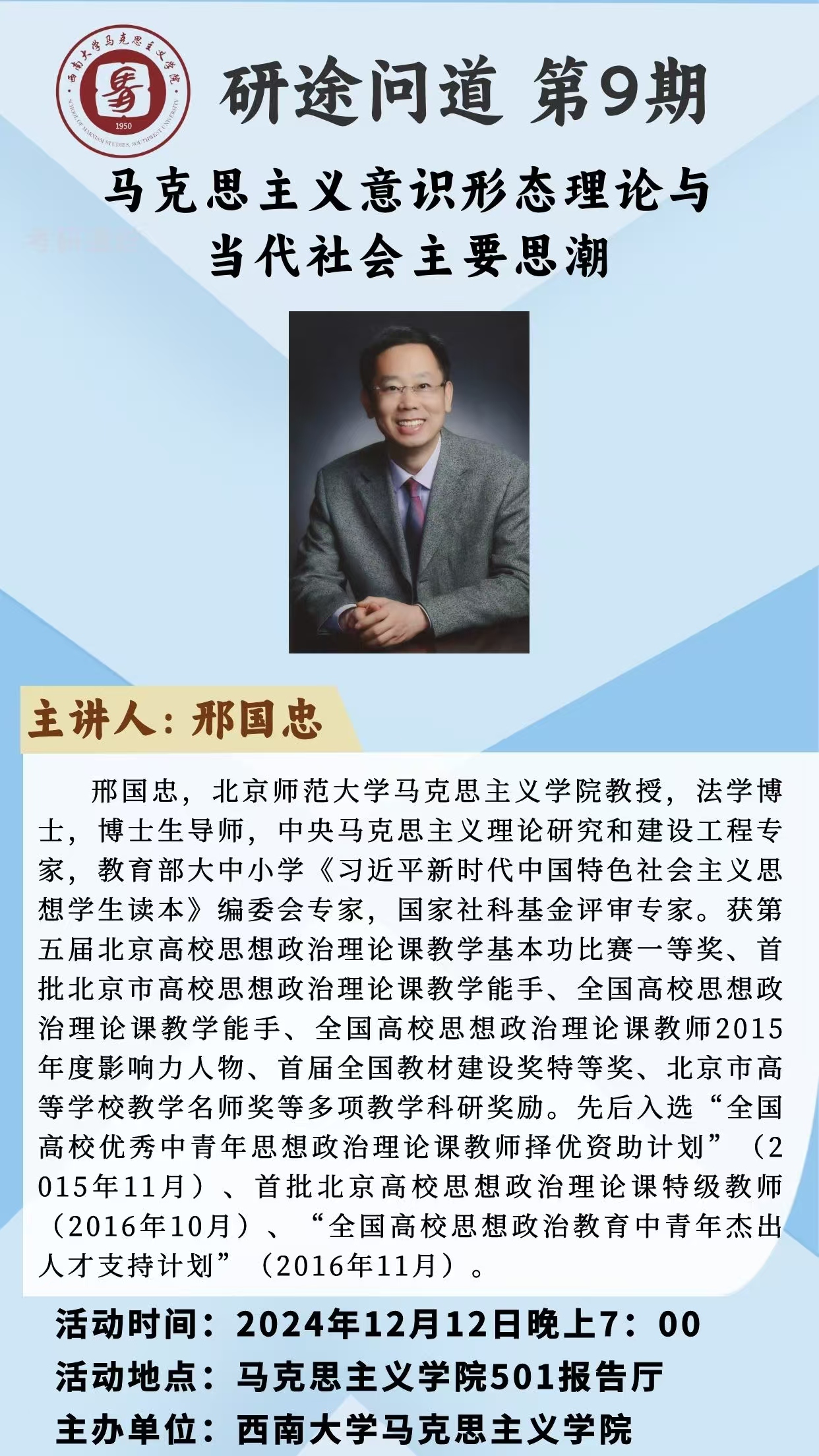 讲座题目:马克思主义意识形态理论与当代社会主要思潮