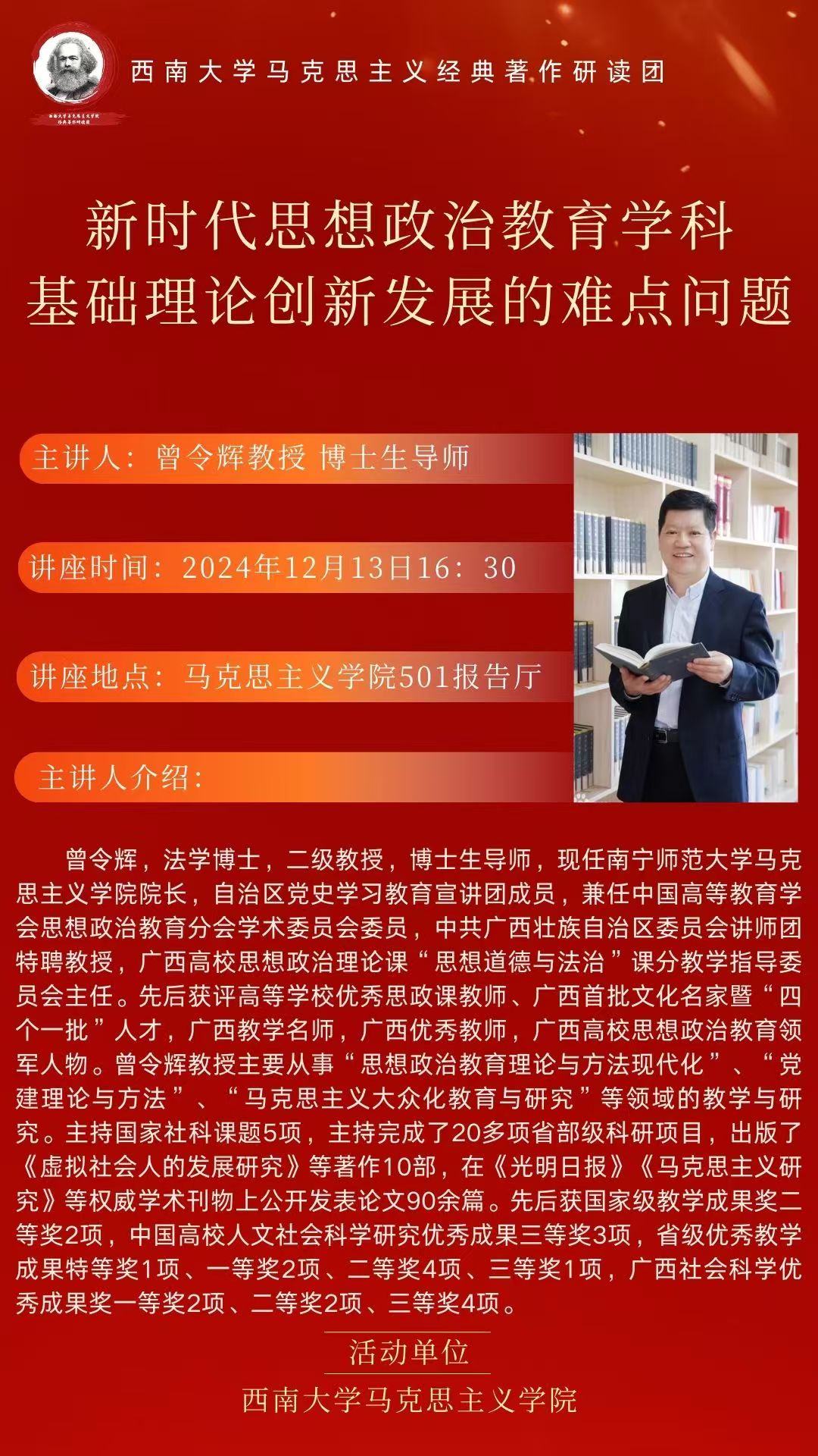 曾令辉,法学博士,二级教授,博士生导师,现任南宁师范大学必赢3003no1线路检测中心院长,自治区党史学习教育宣讲团成员,兼任中国高等教育学会思想政治教育分会学术委员会委员,中共广西壮族自治区委员会讲师团特聘教授,广西高校思想政治理论课“思想道德与法治”课分教学指导委员会主任。先后获评高等学校优秀思政课教师、广西首批文化名家暨“四个一批”人才,广西教学名师,广西优秀教师,广西高校思想政治教育领军人物。曾令辉教授主要从事“思想政治教育理论与方法现代化”、“党建理论与方法”、“马克思主义大众化教育与研究”等领域的教学与研究。主持国家社科课题5项,主持完成了20多项省部级科研项目,出版了《虚拟社会人的发展研究》等著作10部,在《光明日报》《马克思主义研究》等权威学术刊物上公开发表论文90余篇。先后获国家级教学成果奖二等奖2项,中国高校人文社会科学研究优秀成果三等奖3项,省级优秀教学成果特等奖1项、一等奖2项、二等奖4项、三等奖1项,广西社会科学优秀成果奖一等奖2项、二等奖2项、三等奖4项。