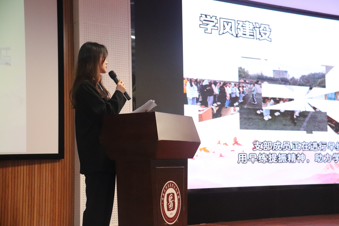 各支部按抽签顺序进行汇报展示、现场答辩和风采展示,11个支部按既定次序依次上台展示,用视频、书法以及朗诵等形式展现支部风貌,各具特色;答辩环节,支部成员才思敏捷、反应迅速,切实反映支部风貌;风采展示环节,各支部都充分展示出本支部积极向上的精神面貌,紧扣“砥砺正当时”的主题,观众认真观看,积极互动,台下掌声雷动。