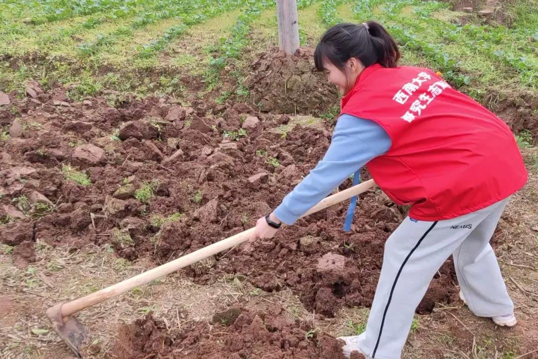 下午,队员们来到了一位小男生的家中,帮助他们家锄地。在上午的走访中队员们了解到,孩子与爷爷奶奶相依为命,爷爷生病行动不便,家中几乎靠奶奶一人操持,转年就要春耕,还有一亩多的地没有翻,队员们于是决定下午一起为小男孩家出一份力,带着从村民家中刚刚借来的锄头,开启了西大青马人的“锄”力之旅。