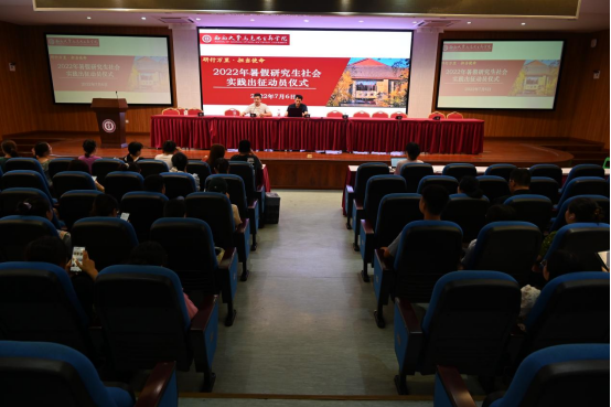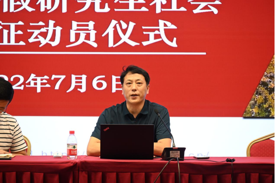 为深学笃用习近平新时代中国特色社会主义思想,引导和帮助广大研究生上好与现实相结合的“大思政课”,在社会课堂中“受教育、长才干、作贡献”,在实践中感悟初心使命、汲取奋进力量,更加坚定科研报国的信心和决心,学院于7月6日下午在505报告厅召开了2022年暑期研究生社会实践出征动员仪式。学院党委副书记、纪委书记刘东升出席本次会议,会议由研究生辅导员王飒主持,2022年暑期社会实践活动全体队员参加。