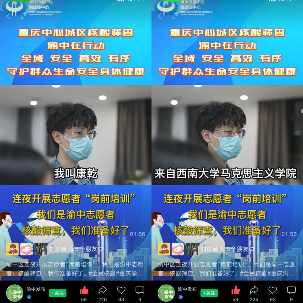 向桂英同学说道:“通过此次志愿服务活动,我也亲自体验到了40多度高温加上防护服的别样汗蒸方式,感受到了每一位医务工作者和志愿者的艰辛。但是我会为超市老板送的一箱箱水,水果店姐姐送的西瓜以及那一句句‘辛苦了!’而感到满足。同时,我也希望能够有更多的爱心人士投入到志愿服务中来,收获‘无价的回报’。我相信重庆人民众志成城,一定能战胜疫情、旱情、火情!”。同时,康乾同学以必赢3003no1线路检测中心必赢3003no1线路检测中心学生的身份接受了渝中区融媒体中心采访,拍摄抗疫纪录片并发布到抖音、微信等平台的官方媒体帐号上。两位同学用热情和奉献,在疫情大考中彰显青春担当,展现了马院学子的优秀品质,用耐心与毅力,展现了学生志愿者的初心使命。